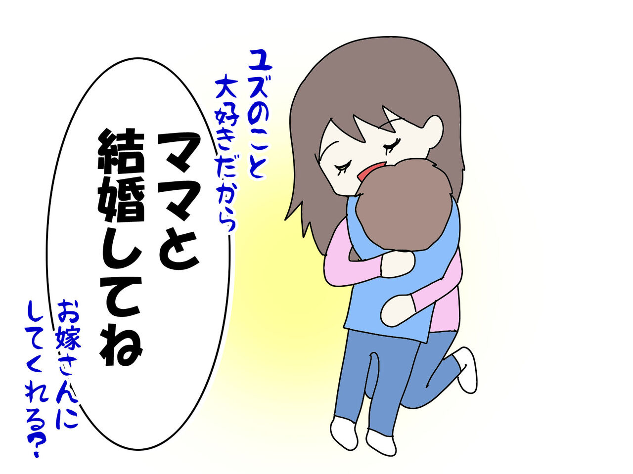 息子にとって「結婚=チュー」なので、息子は私を自分の方に振り向かせるために、「結婚して」と言い出したのでしょう。