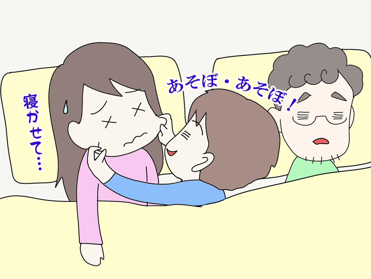 ここ最近になって、娘は一人で起きて、テレビやタブレットを見たりして一人で静か過ごしてくれるようになったのですが、小さな息子は「ママと一緒にねんね」と言って、私たちのベッドにモグリ込んでくるんです。